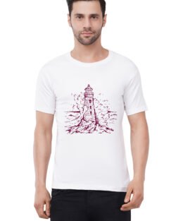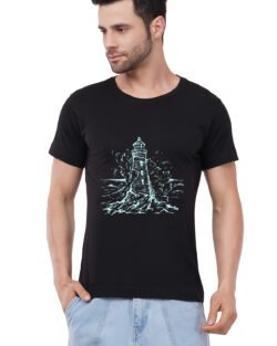 Caseria Men’s Cotton Graphic Printed Half Sleeve T-Shirt – Water Wave Lighthouse