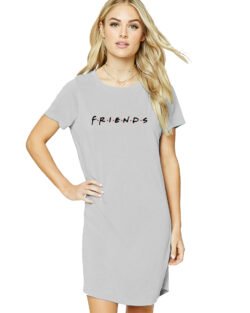 Caseria Women’s Cotton Biowash Graphic Printed T-Shirt Dress with side pockets – Friends