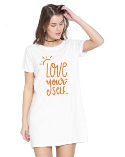 Caseria Women’s Cotton Biowash Graphic Printed T-Shirt Dress with side pockets – Love Yourself