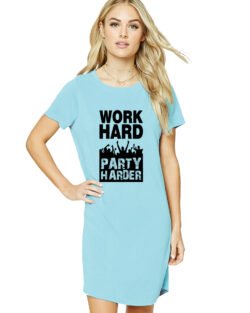 Caseria Women’s Cotton Biowash Graphic Printed T-Shirt Dress with side pockets – Work Party Harder