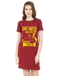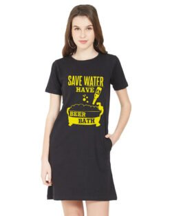 Caseria Women’s Cotton Biowash Graphic Printed T-Shirt Dress with side pockets – Save Water Beer Bath