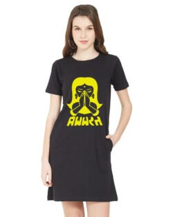 Caseria Women’s Cotton Biowash Graphic Printed T-Shirt Dress with side pockets – Aawrat