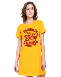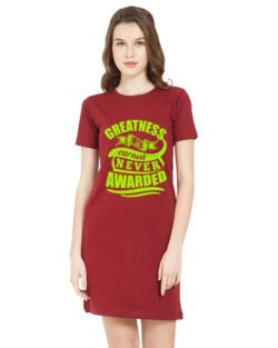 Caseria Women’s Cotton Biowash Graphic Printed T-Shirt Dress with side pockets – Greatness Never Awarded