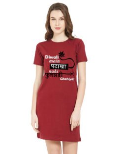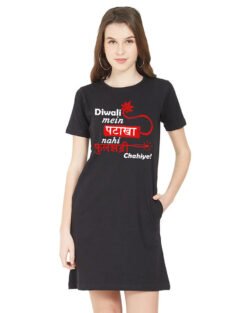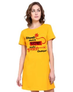 Caseria Women’s Cotton Biowash Graphic Printed T-Shirt Dress with side pockets – Diwali Patakha Fulchhadi