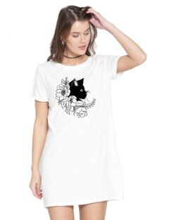 Caseria Women’s Cotton Biowash Graphic Printed T-Shirt Dress with side pockets – Cat Flower