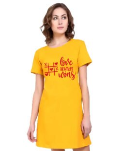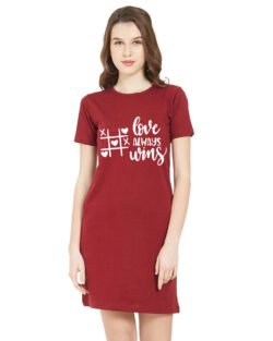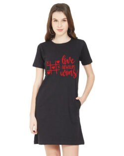 Caseria Women’s Cotton Biowash Graphic Printed T-Shirt Dress with side pockets – Love Always Wins