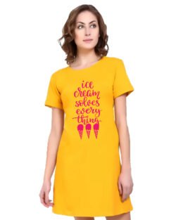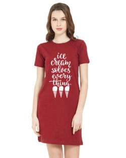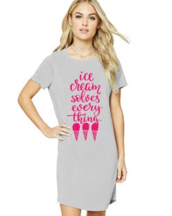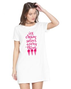 Caseria Women’s Cotton Biowash Graphic Printed T-Shirt Dress with side pockets – Ice-cream Solves Everything