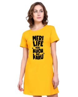 Caseria Women’s Cotton Biowash Graphic Printed T-Shirt Dress with side pockets – Kuch Bhi Karu