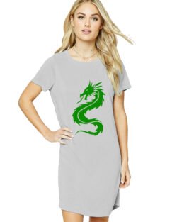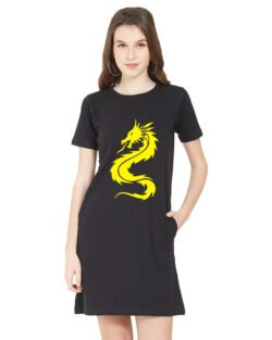 Caseria Women’s Cotton Biowash Graphic Printed T-Shirt Dress with side pockets – Chinese Dragon