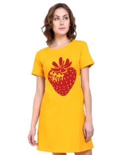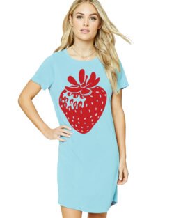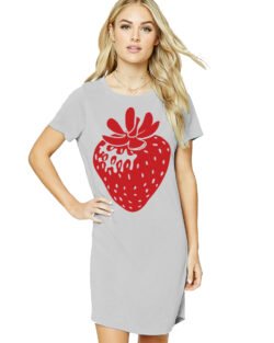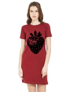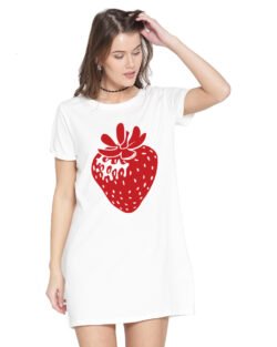 Caseria Women’s Cotton Biowash Graphic Printed T-Shirt Dress with side pockets – Strawberry