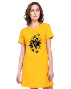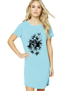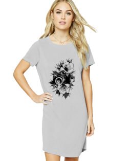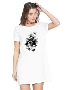 Caseria Women’s Cotton Biowash Graphic Printed T-Shirt Dress with side pockets – Flower Camera