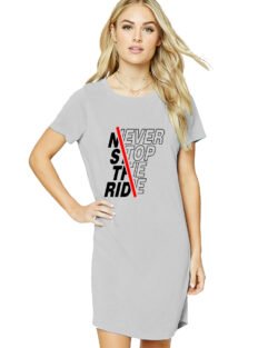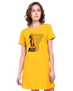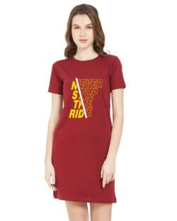 Caseria Women’s Cotton Biowash Graphic Printed T-Shirt Dress with side pockets – Never Stop Ride