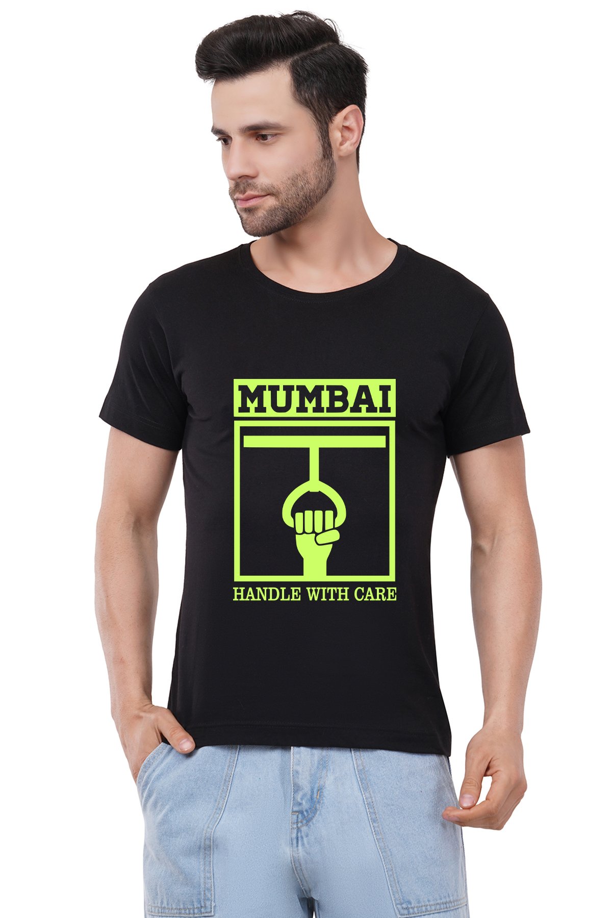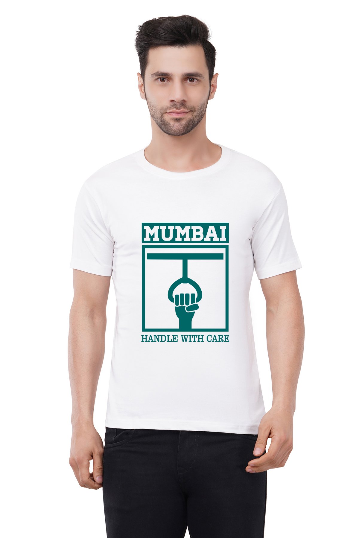 Caseria Men's Cotton Graphic Printed Half Sleeve T-Shirt - Mumbai Handle With Care