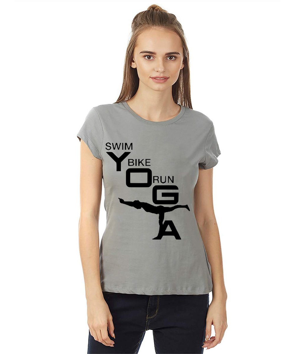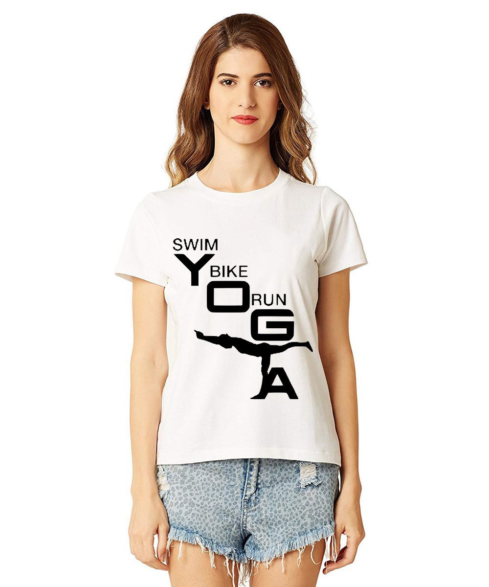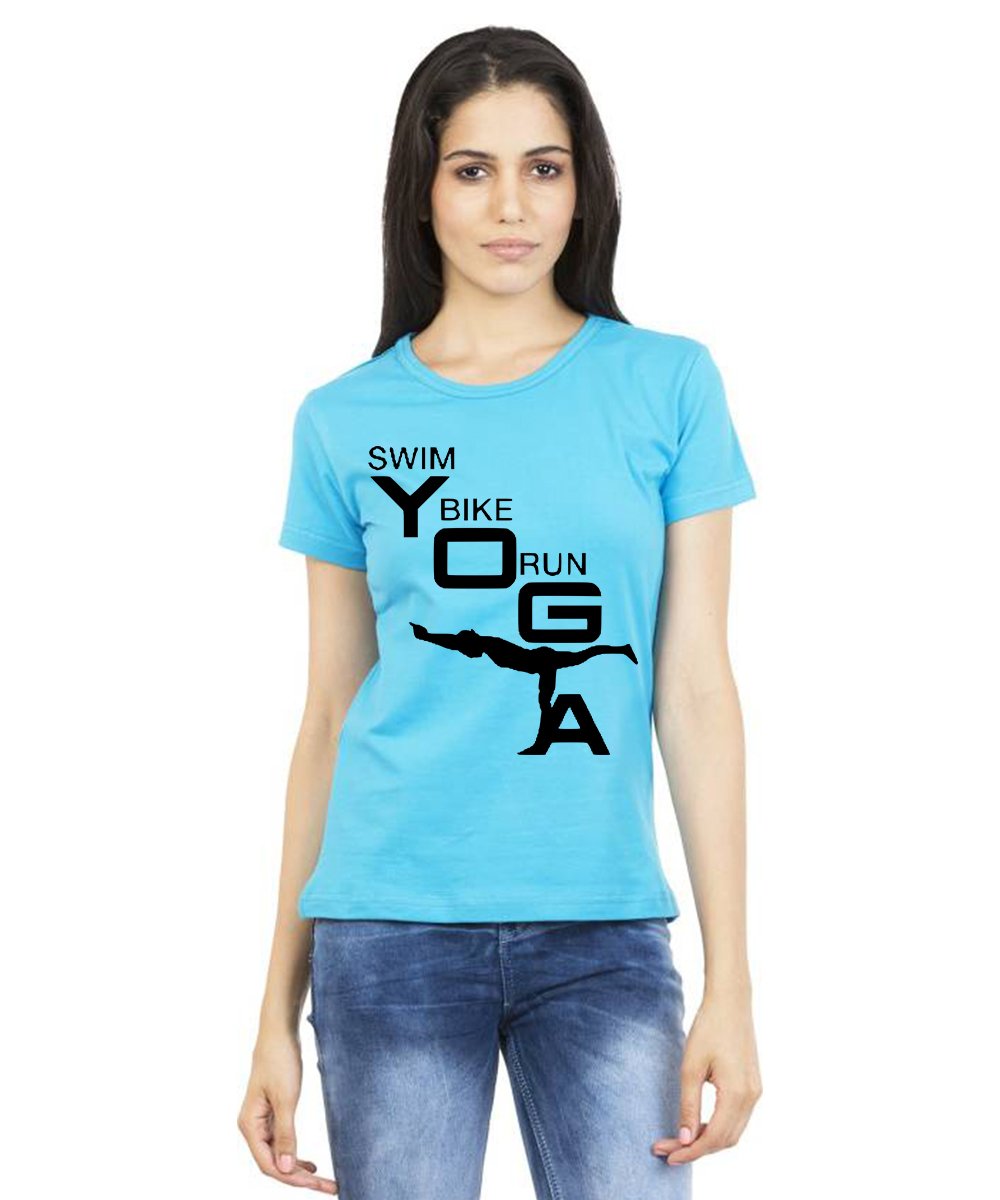 Caseria Women's Cotton Biowash Graphic Printed Half Sleeve T-Shirt - Swim Bike Run Yoga