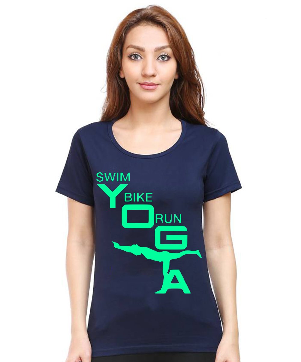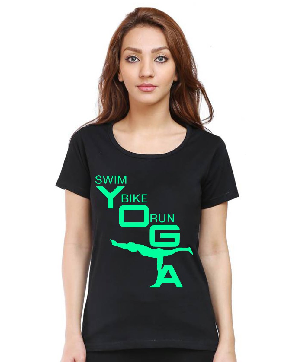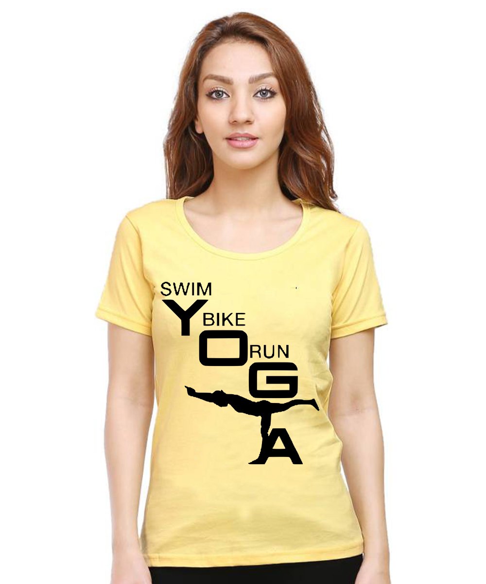 Caseria Women's Cotton Biowash Graphic Printed Half Sleeve T-Shirt - Swim Bike Run Yoga