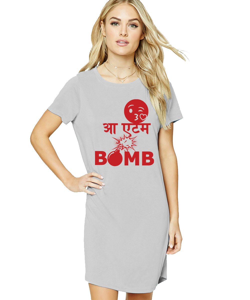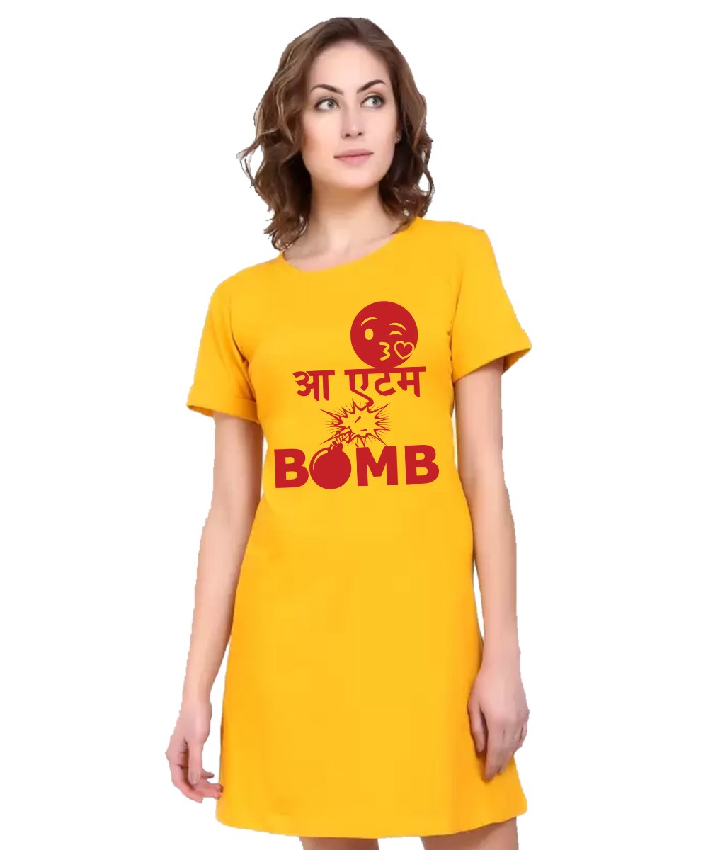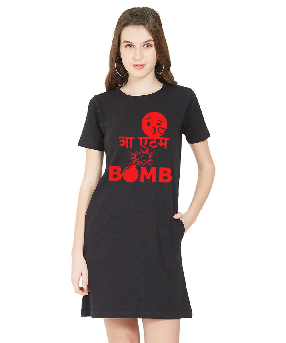 Caseria Women's Cotton Biowash Graphic Printed T-Shirt Dress with side pockets - Atom Bomb