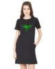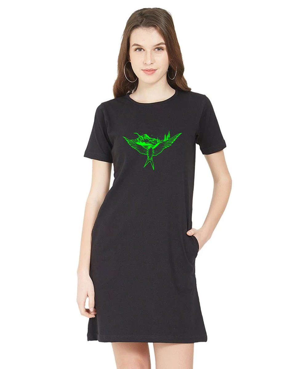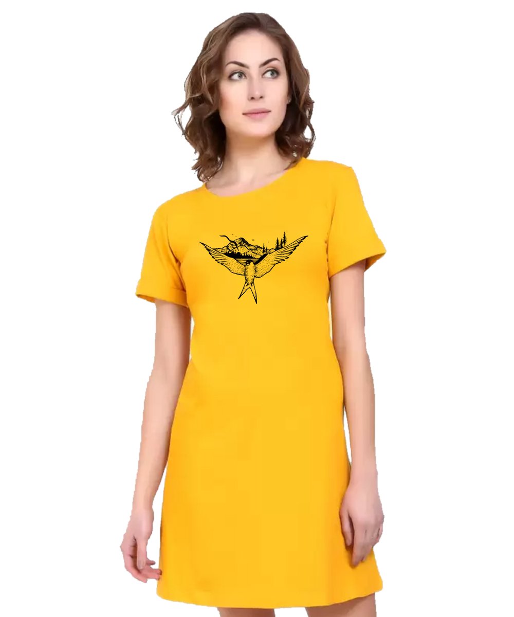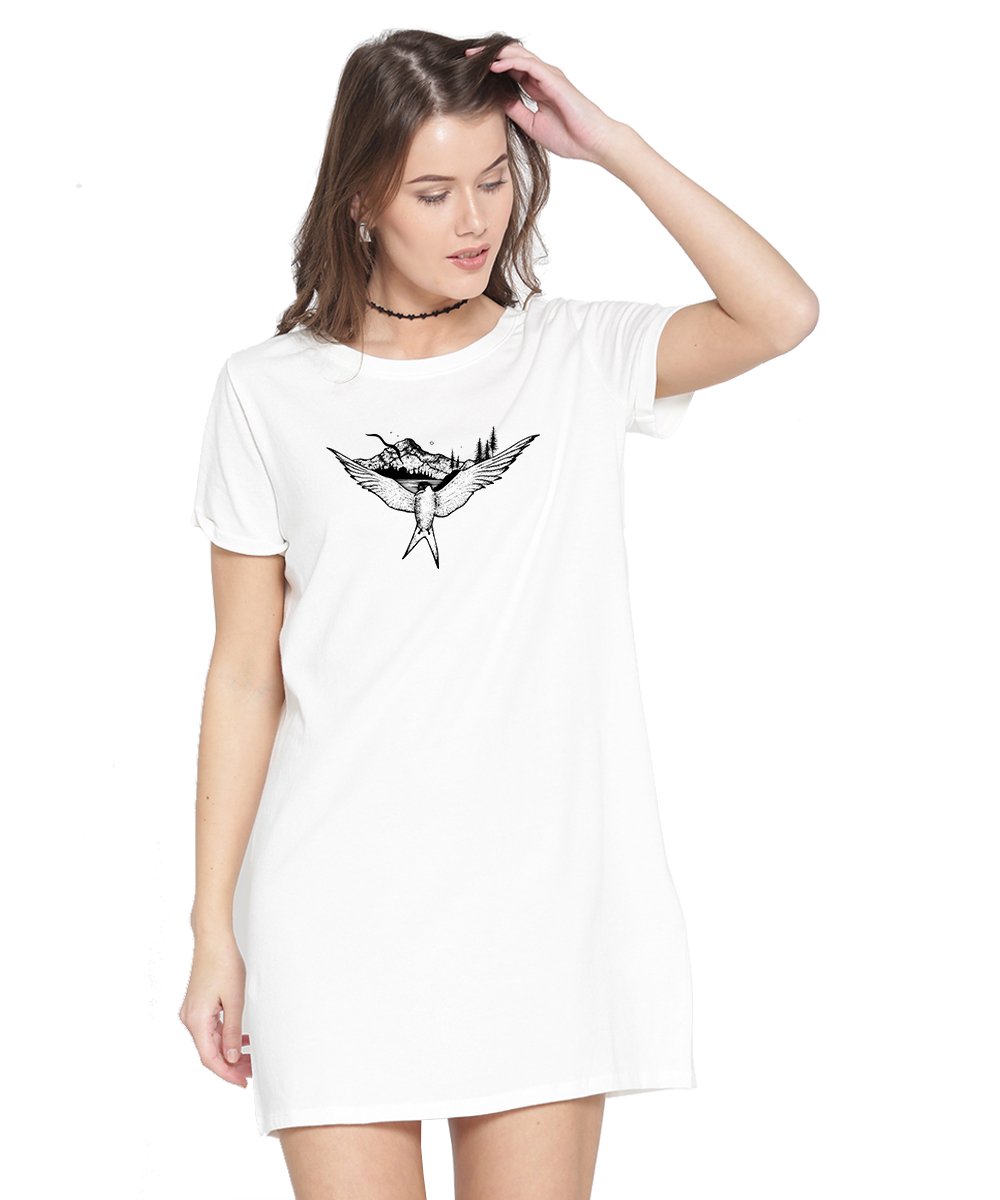 Caseria Women's Cotton Biowash Graphic Printed T-Shirt Dress with side pockets - Bird Sea