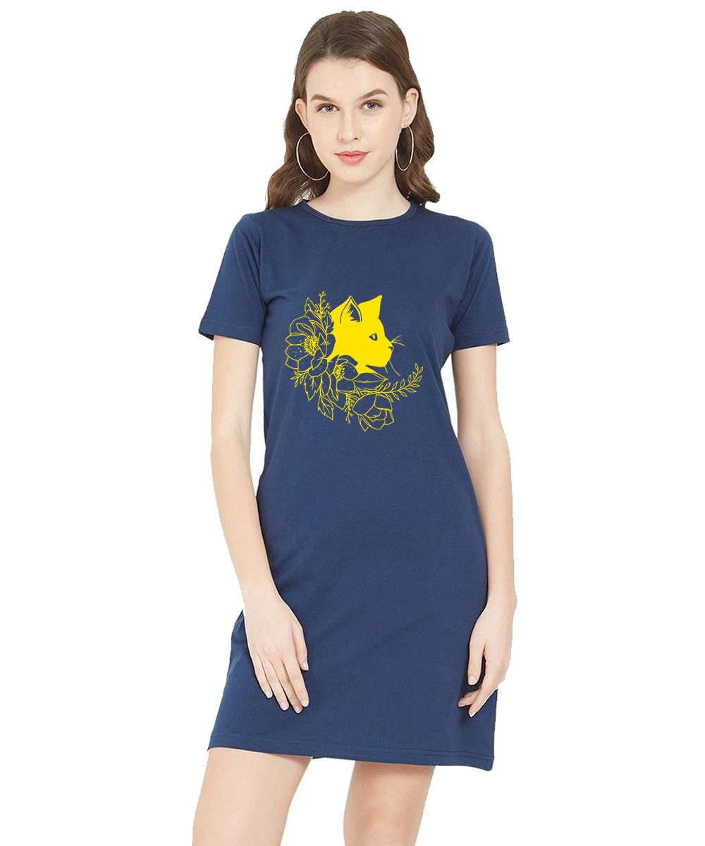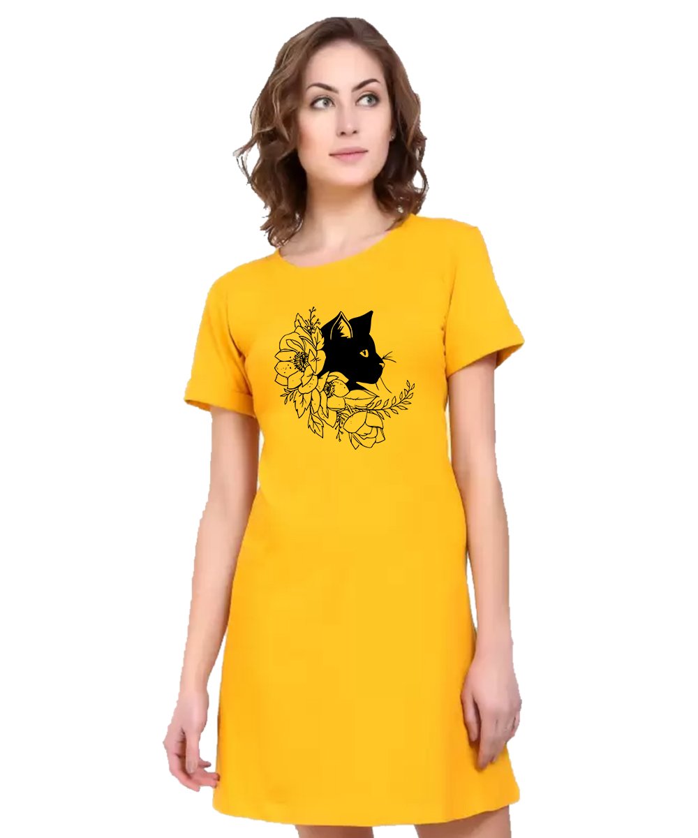 Caseria Women's Cotton Biowash Graphic Printed T-Shirt Dress with side pockets - Cat Flower