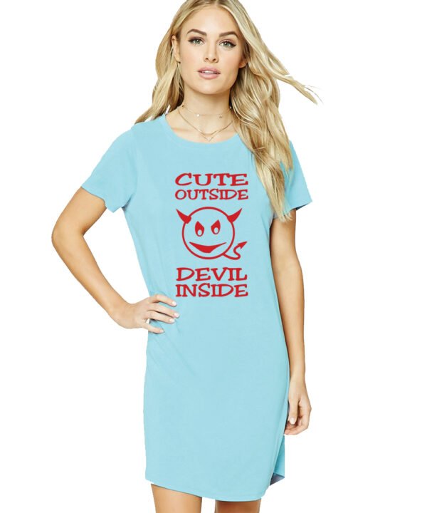 Caseria Women's Cotton Biowash Graphic Printed T-Shirt Dress with side pockets - Cute Outside Devil Inside
