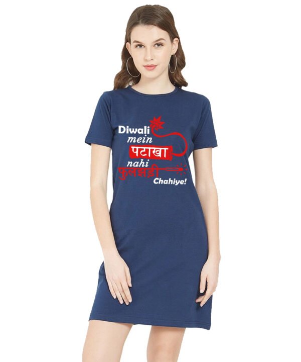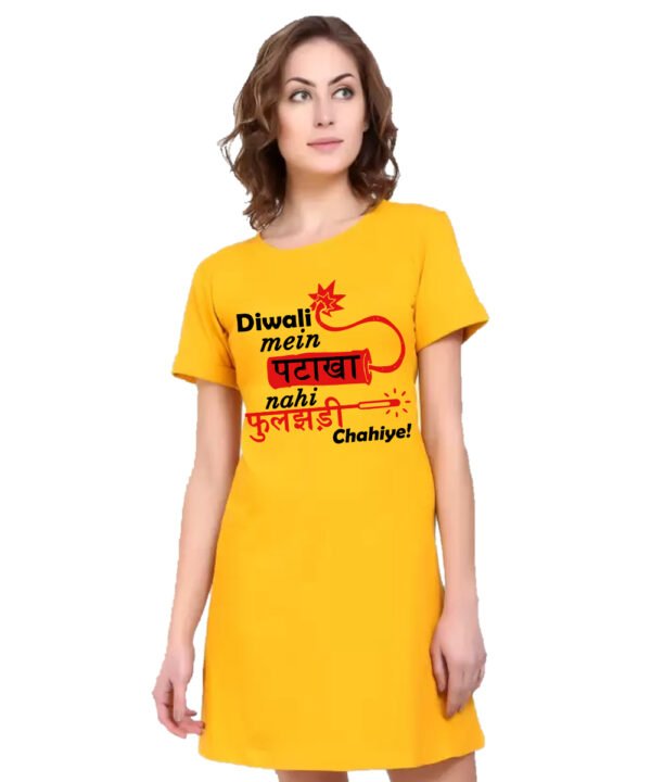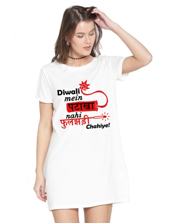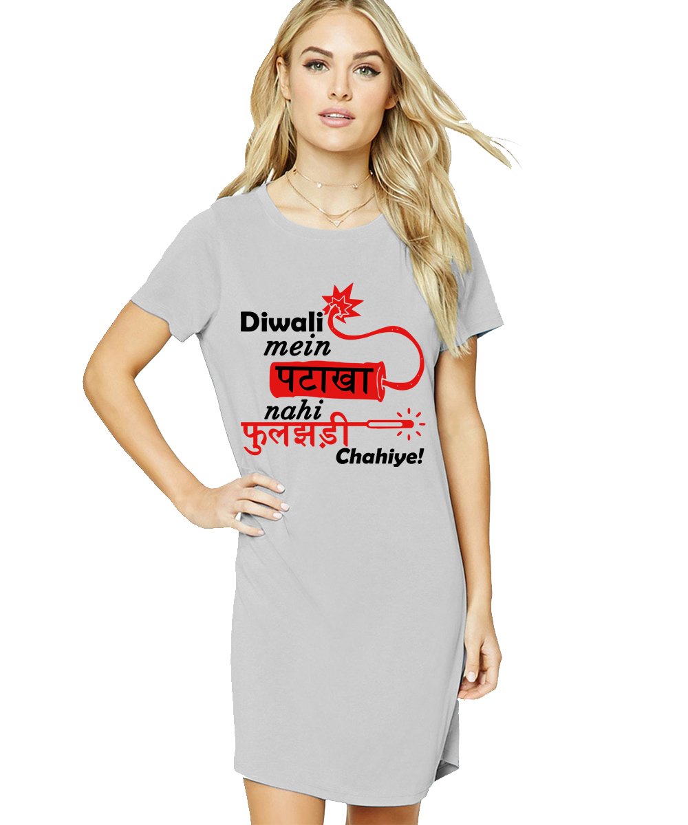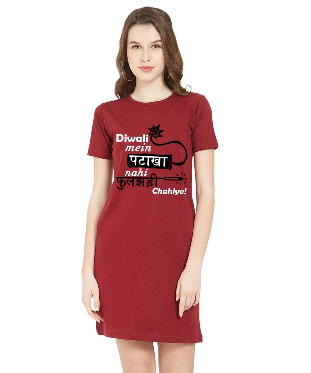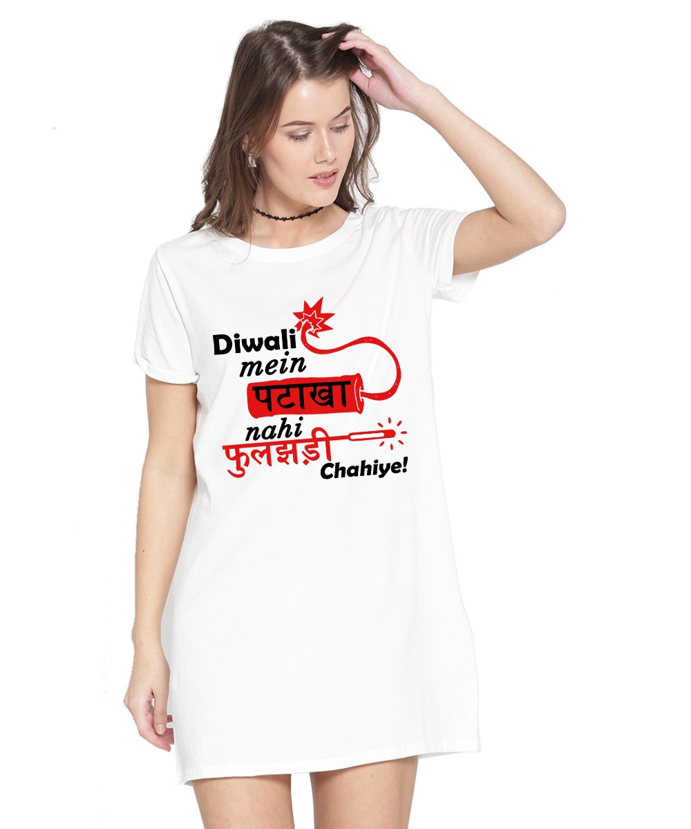 Caseria Women's Cotton Biowash Graphic Printed T-Shirt Dress with side pockets - Diwali Patakha Fulchhadi