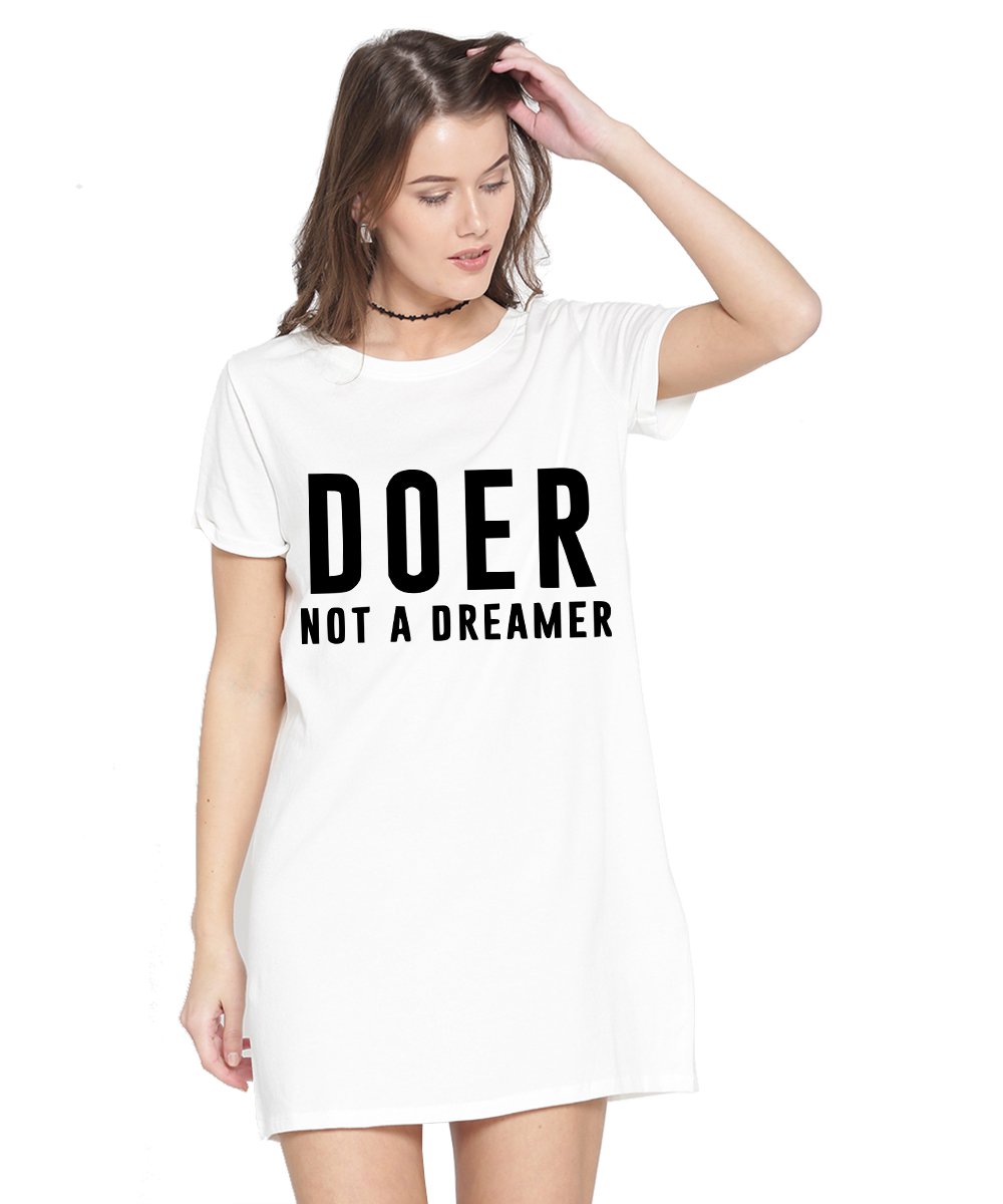Caseria Women's Cotton Biowash Graphic Printed T-Shirt Dress with side pockets - Doer Not Dreamer