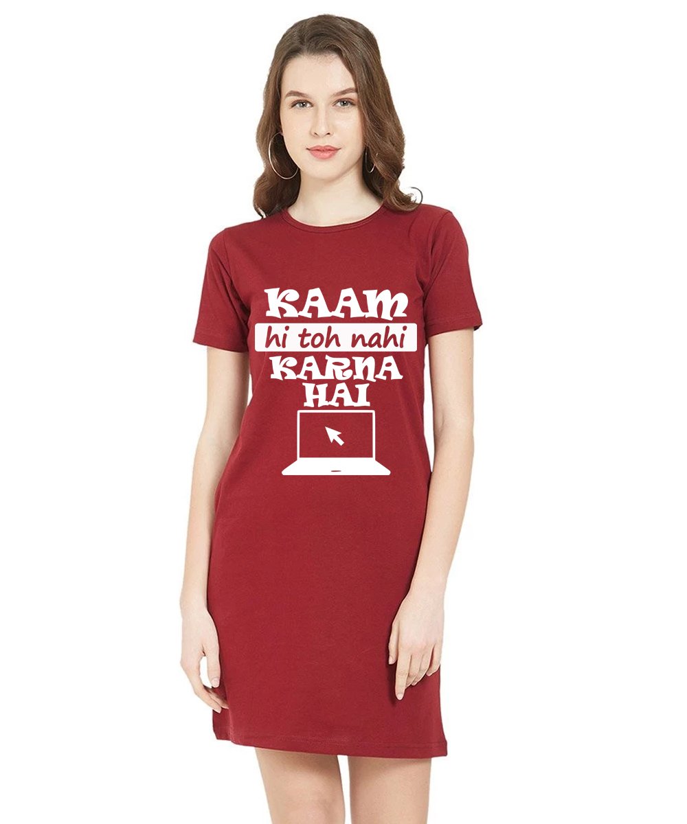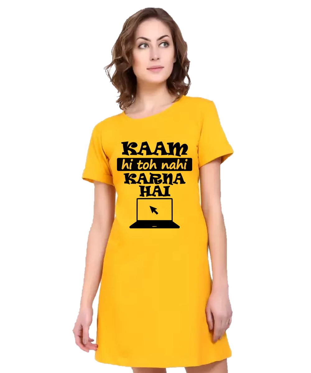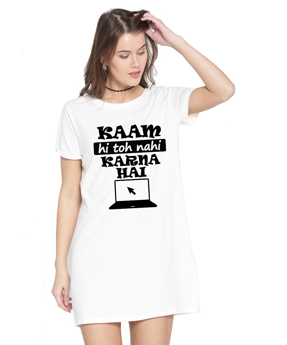 Caseria Women's Cotton Biowash Graphic Printed T-Shirt Dress with side pockets - Kaam Nahi Karna