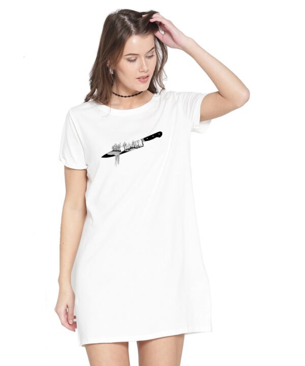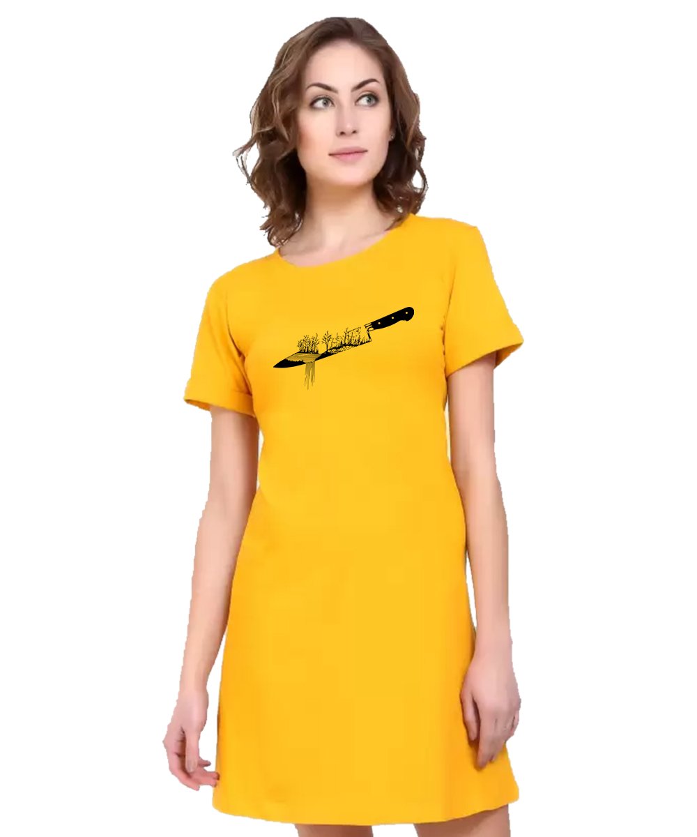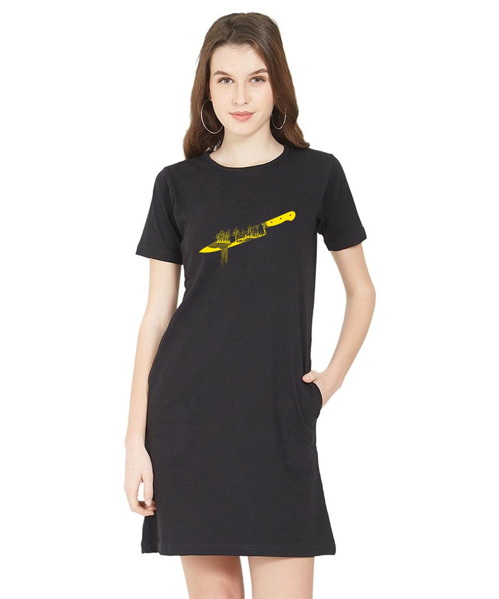 Caseria Women's Cotton Biowash Graphic Printed T-Shirt Dress with side pockets - Knife Nature
