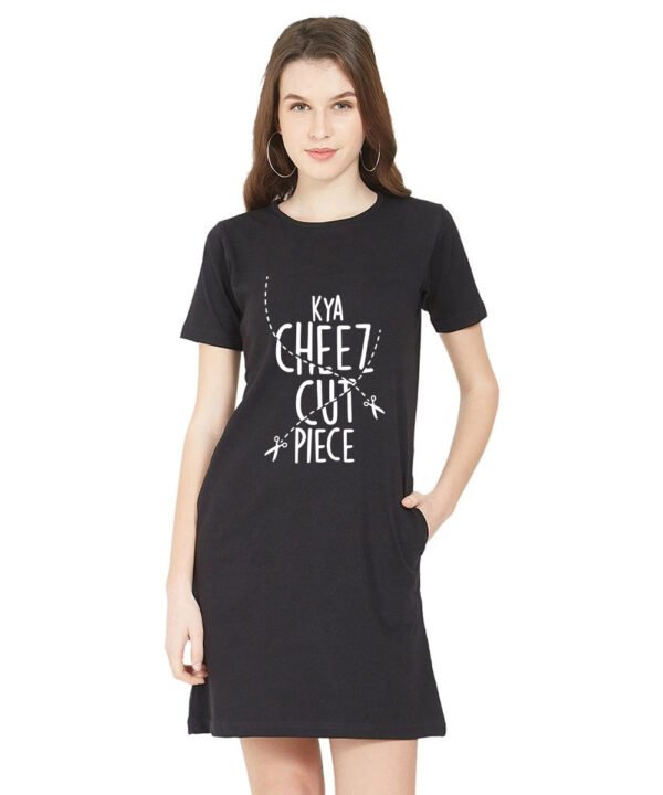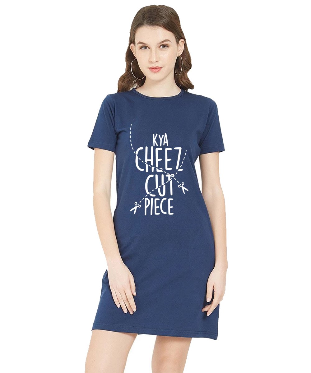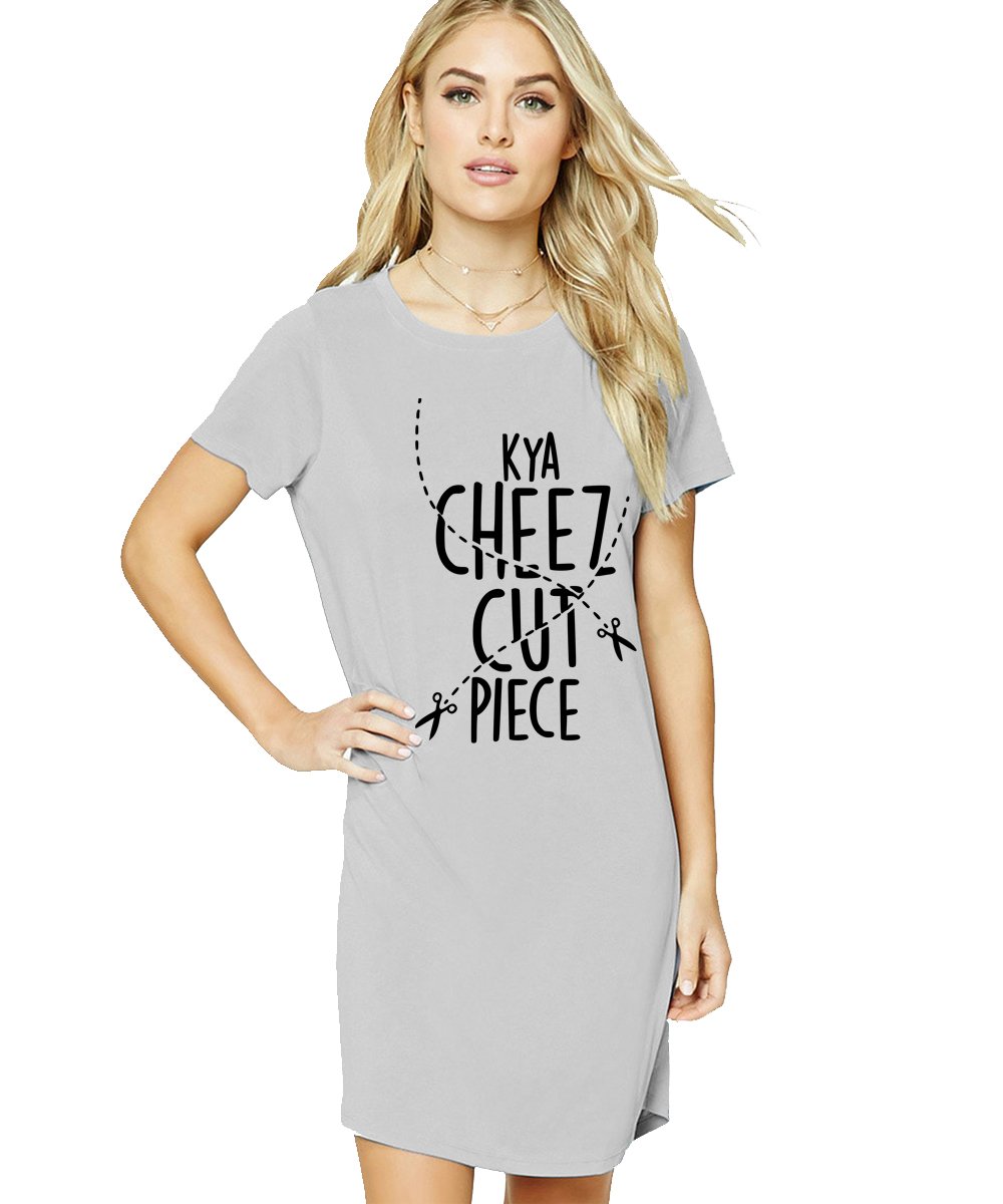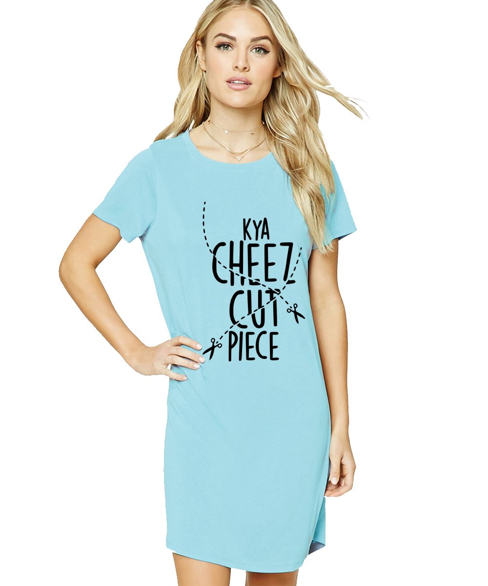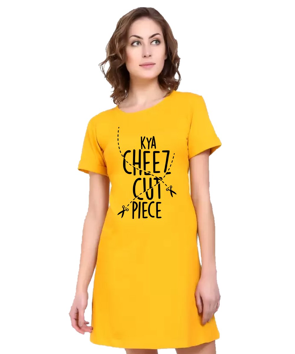 Caseria Women's Cotton Biowash Graphic Printed T-Shirt Dress with side pockets - Kya Cheese