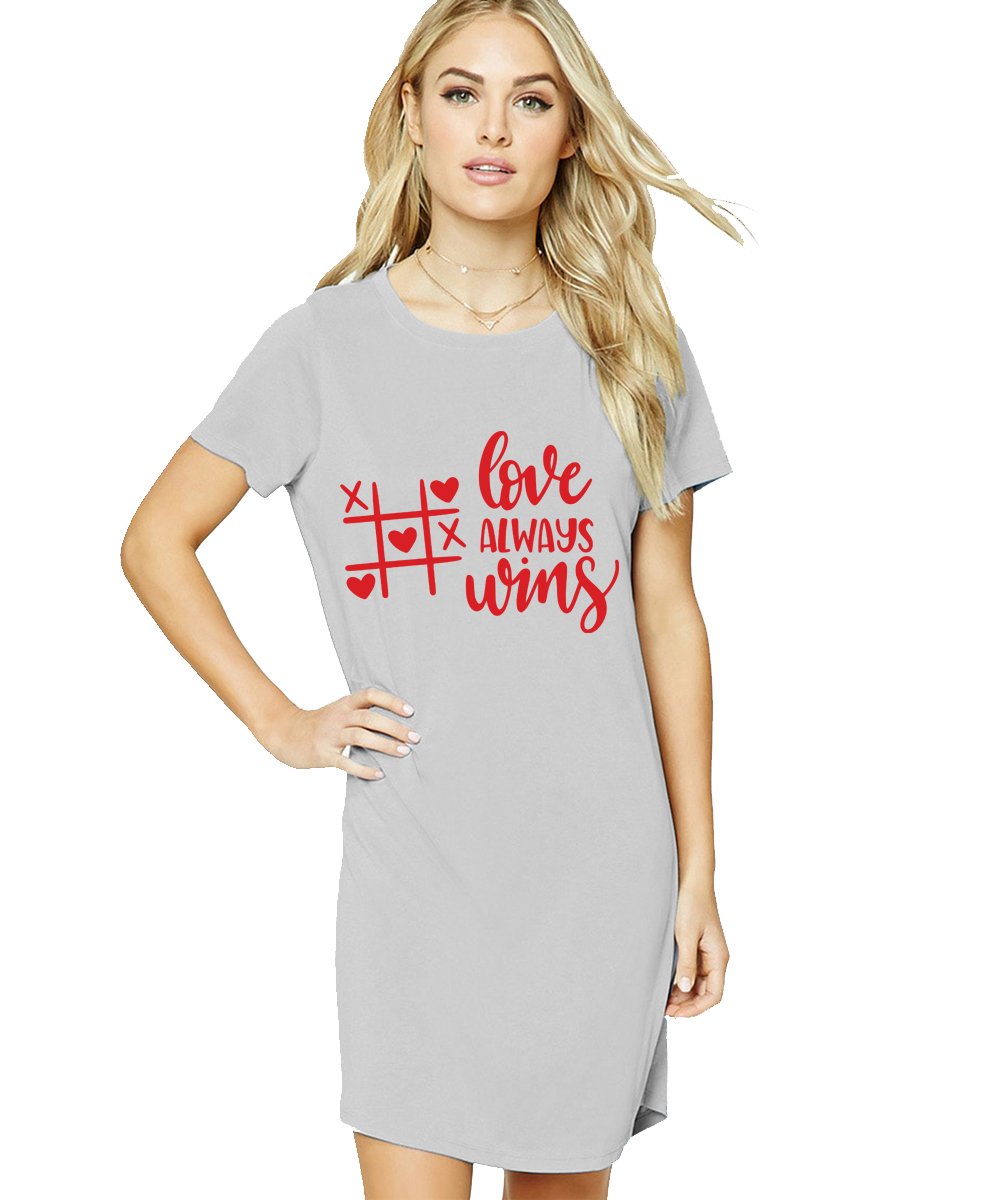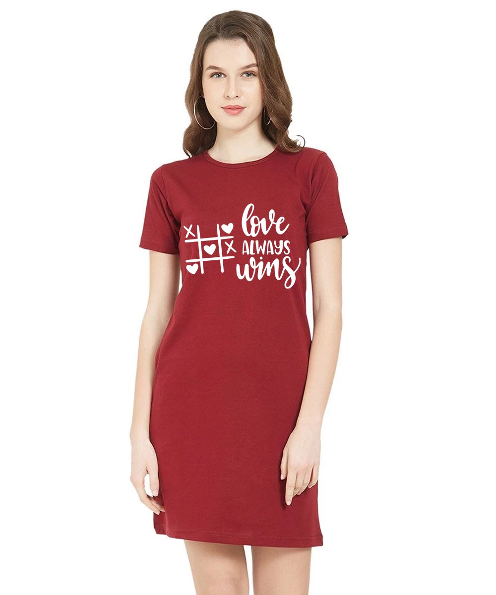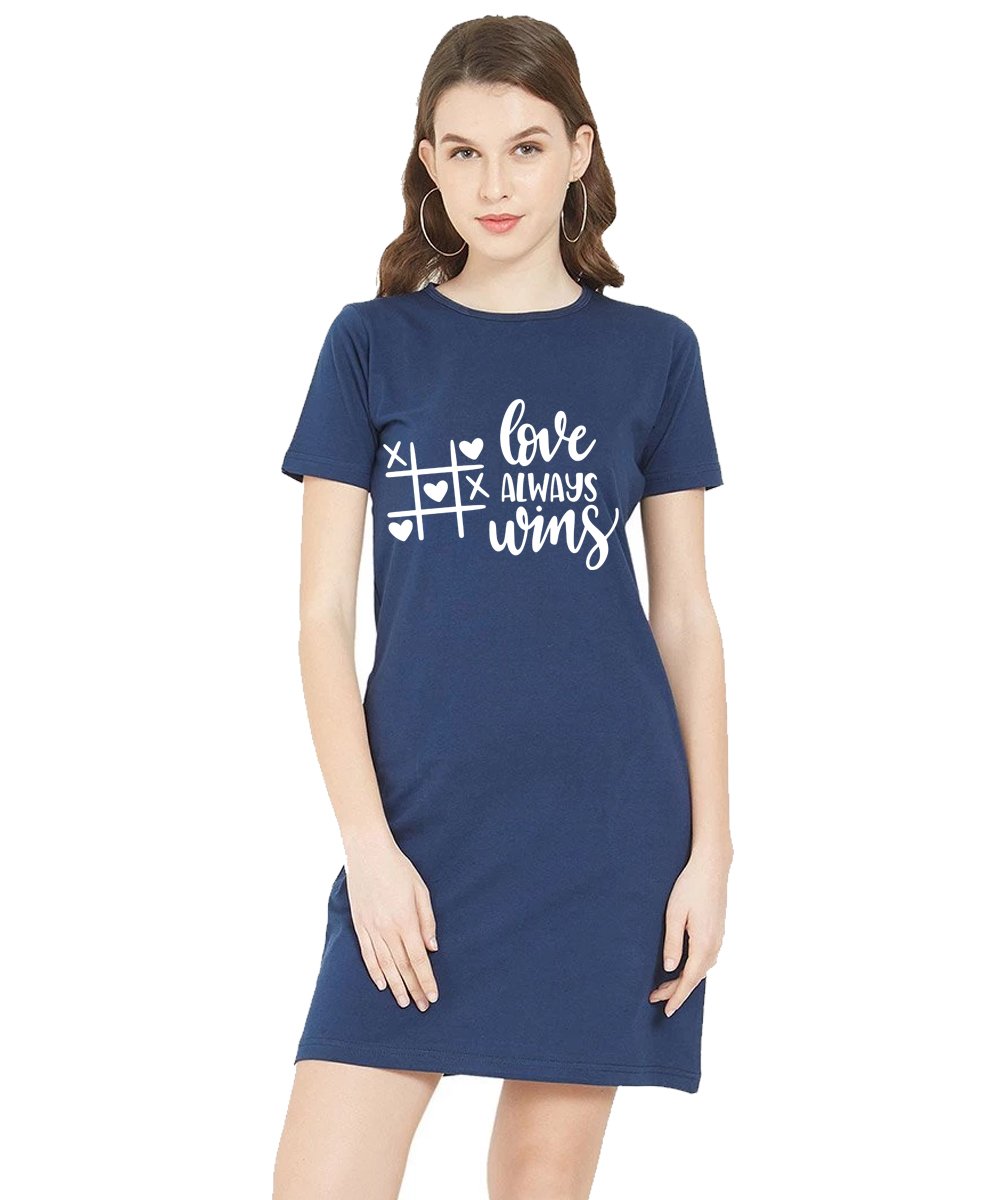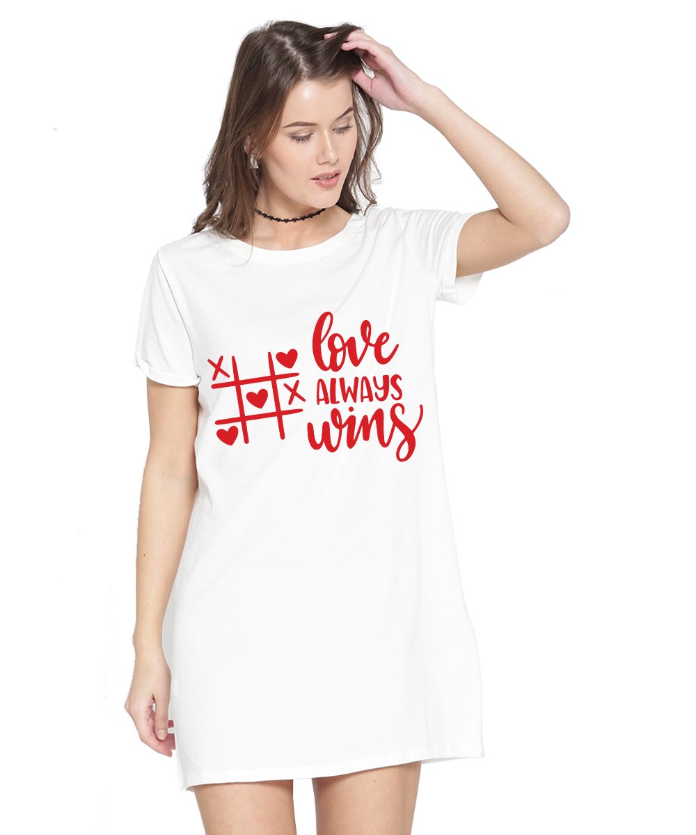 Caseria Women's Cotton Biowash Graphic Printed T-Shirt Dress with side pockets - Love Always Wins