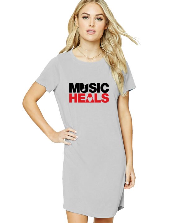 Caseria Women's Cotton Biowash Graphic Printed T-Shirt Dress with side pockets - Music Heals Pattern