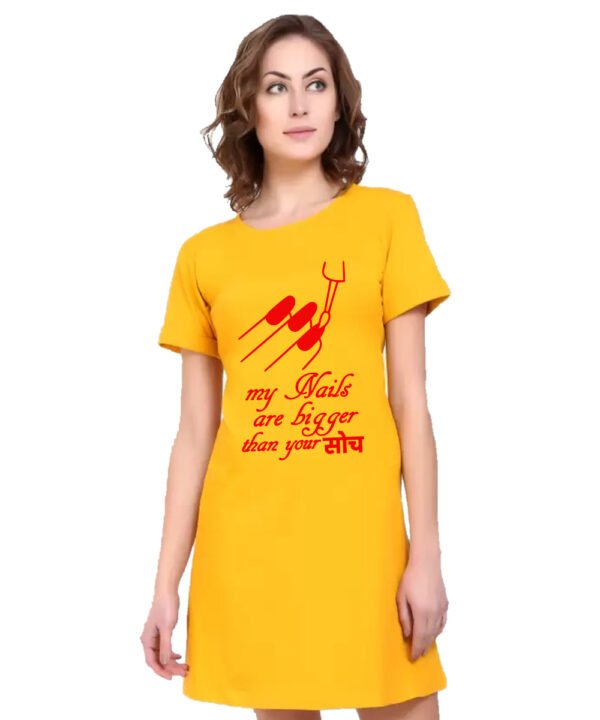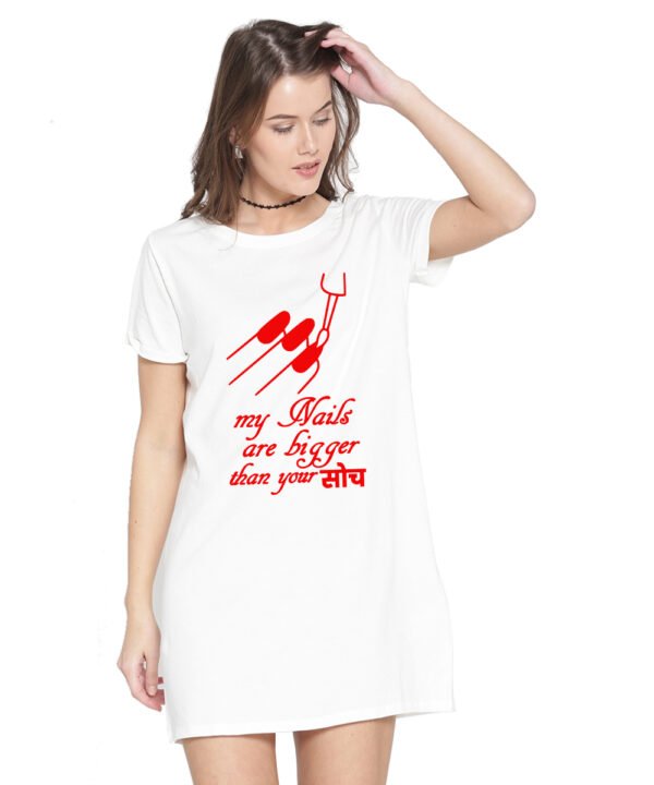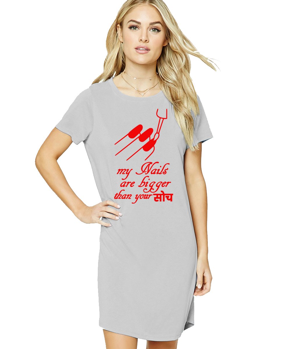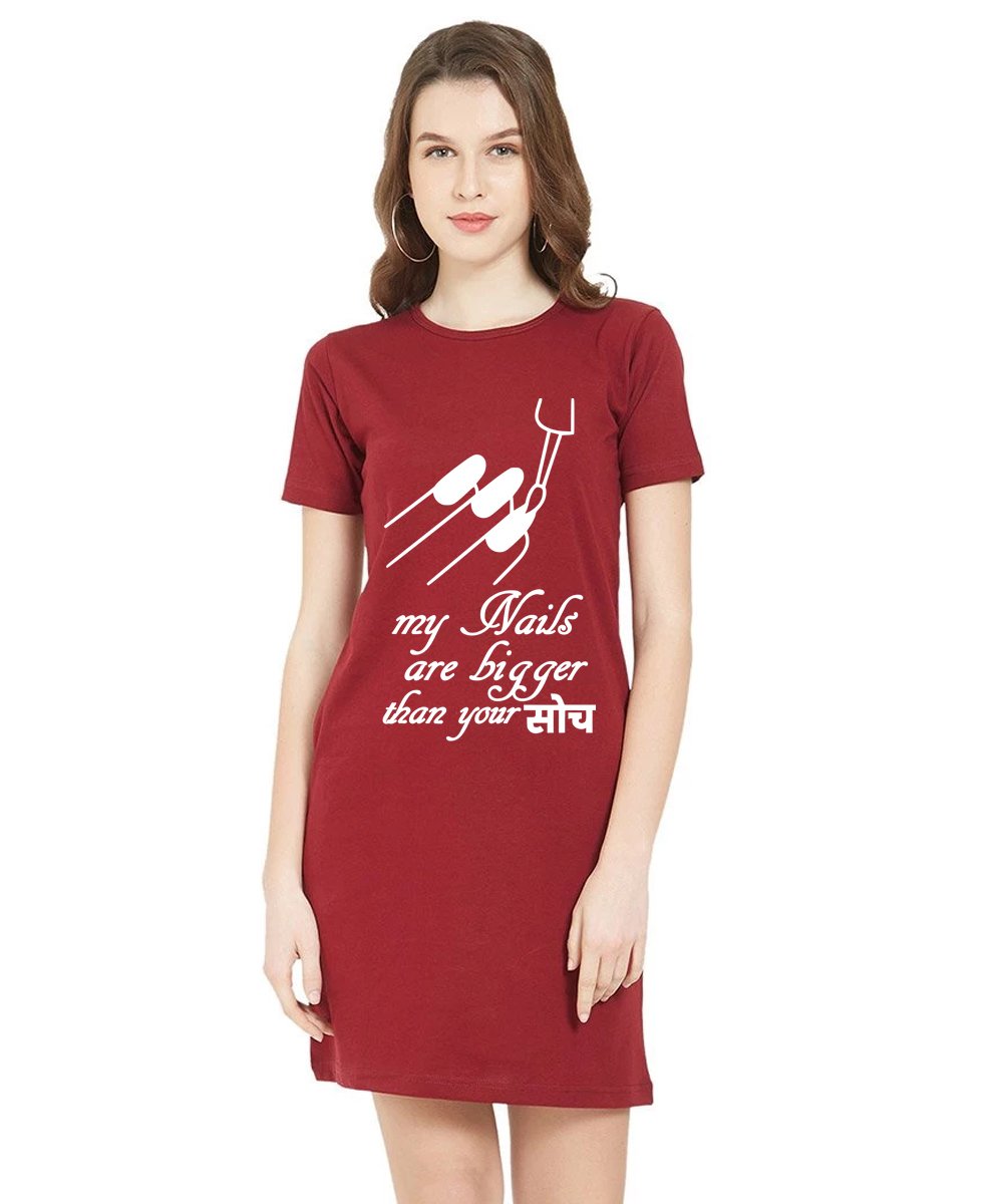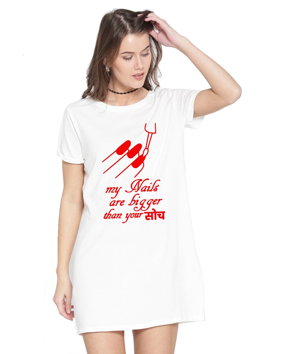 Caseria Women's Cotton Biowash Graphic Printed T-Shirt Dress with side pockets - Nails Are Bigger