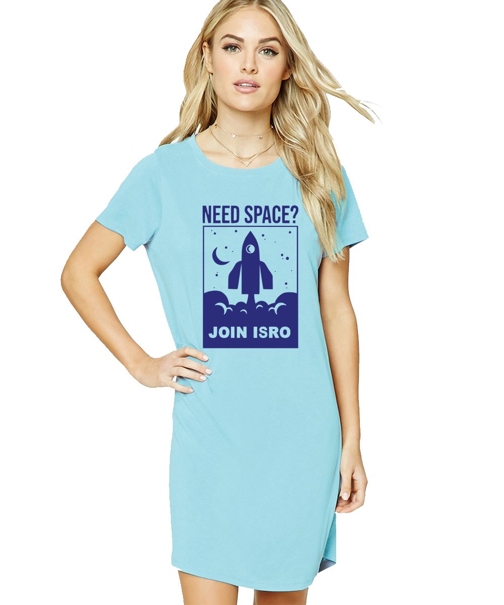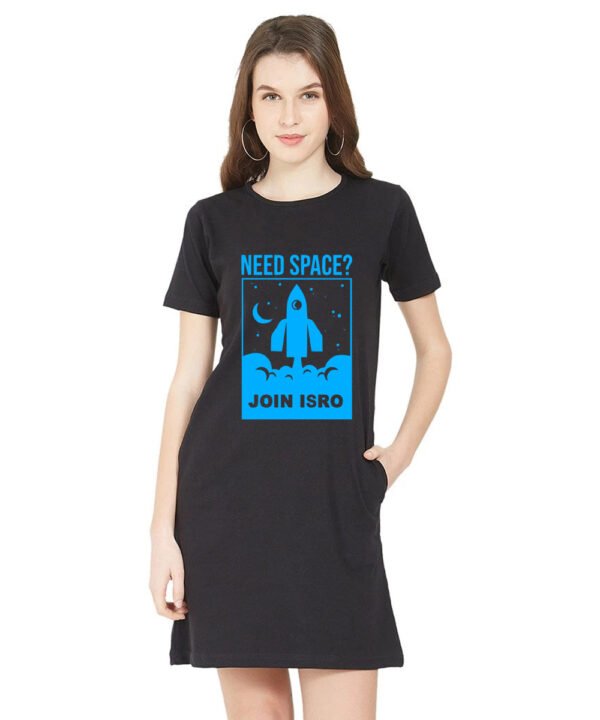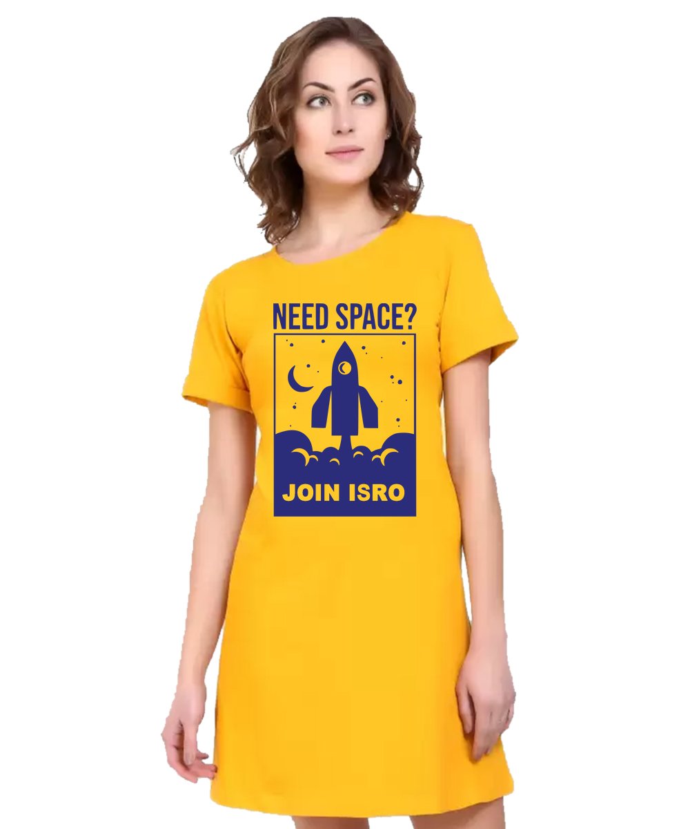 Caseria Women's Cotton Biowash Graphic Printed T-Shirt Dress with side pockets - Need Space Join Isro