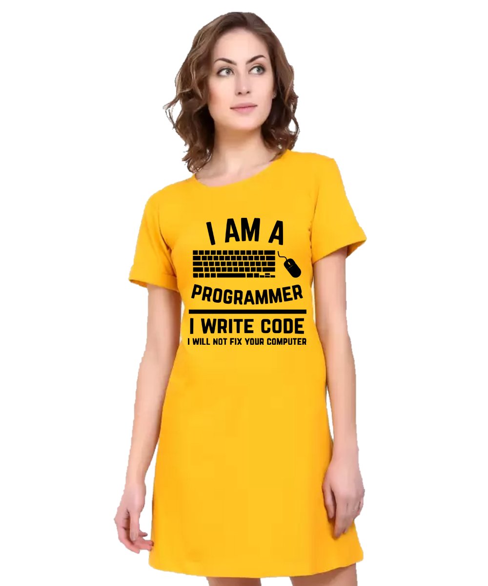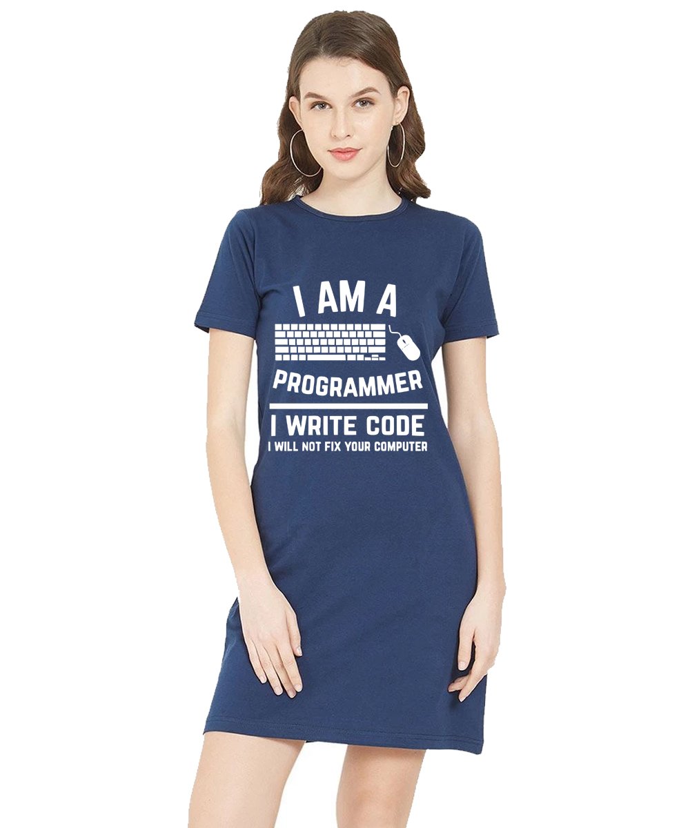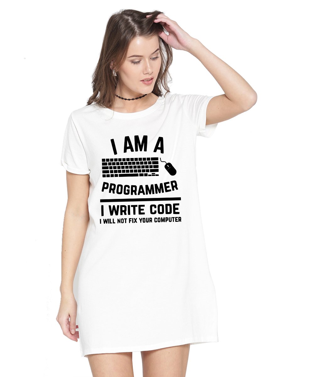 Caseria Women's Cotton Biowash Graphic Printed T-Shirt Dress with side pockets - Programmer Write Code