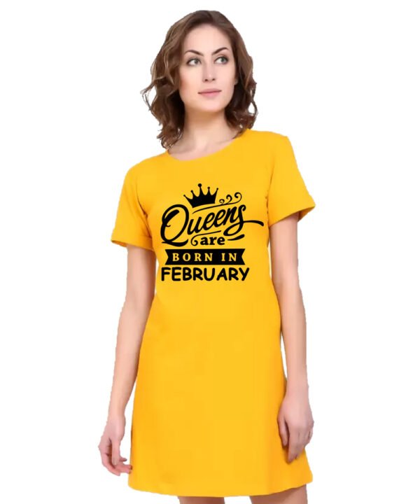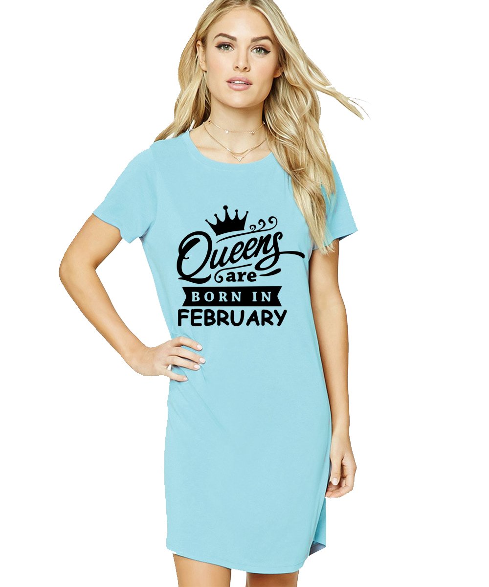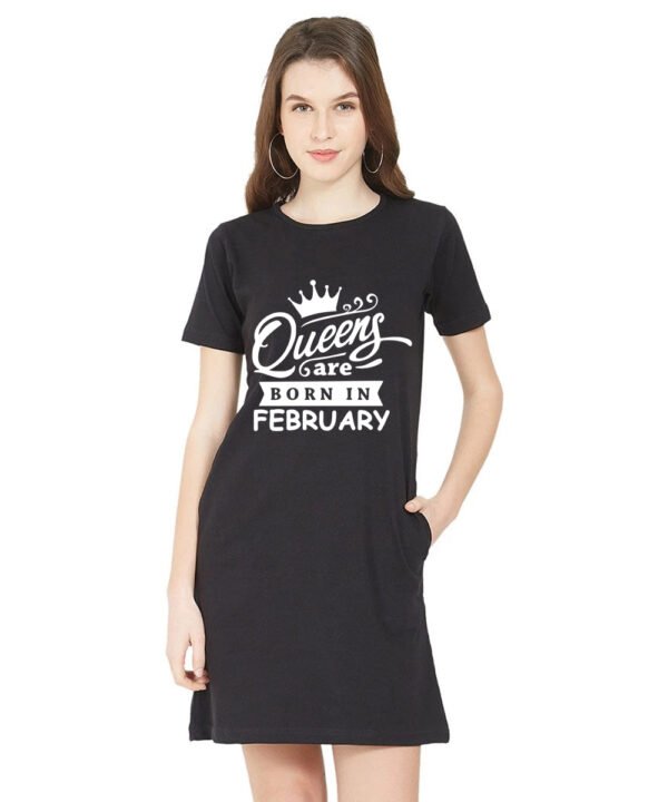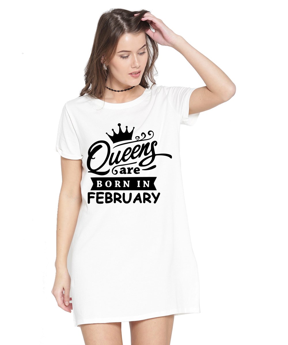 Caseria Women's Cotton Biowash Graphic Printed T-Shirt Dress with side pockets - Queens Born In Feb