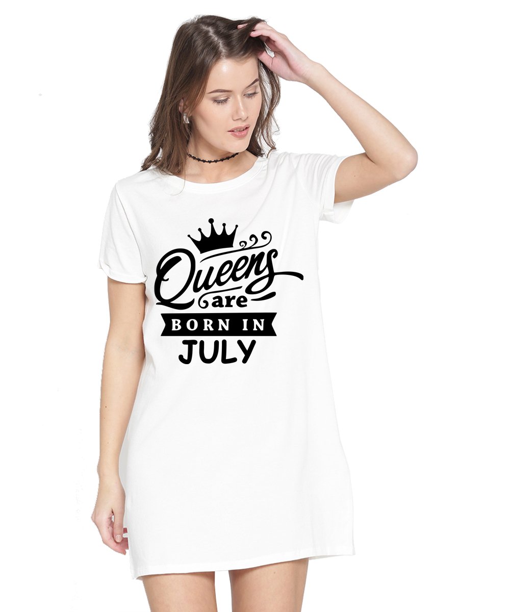 Caseria Women's Cotton Biowash Graphic Printed T-Shirt Dress with side pockets - Queens Born In July