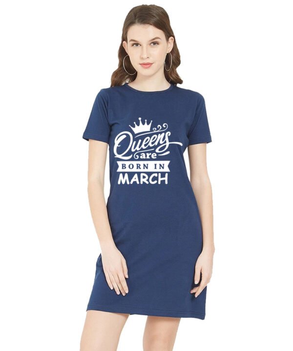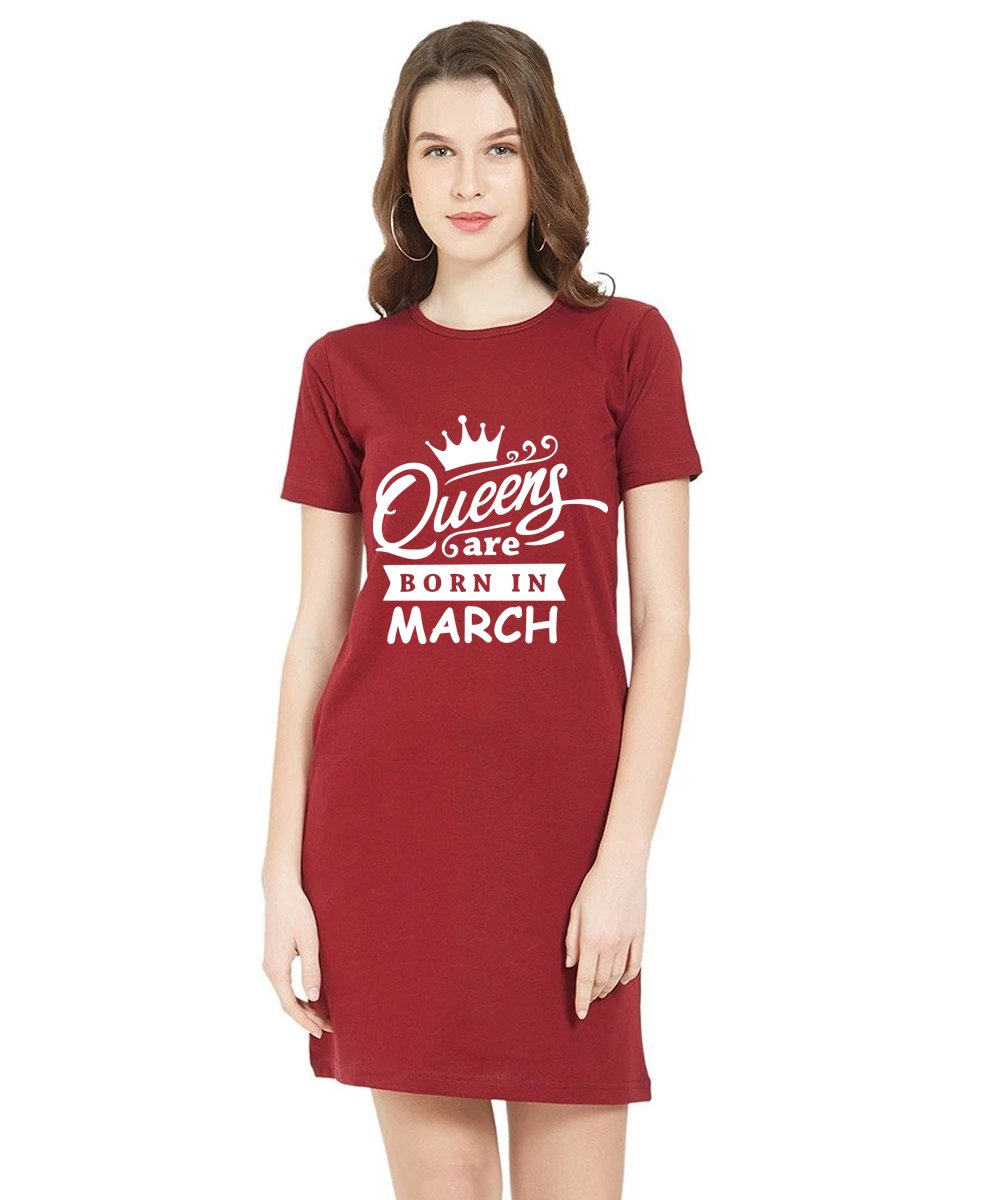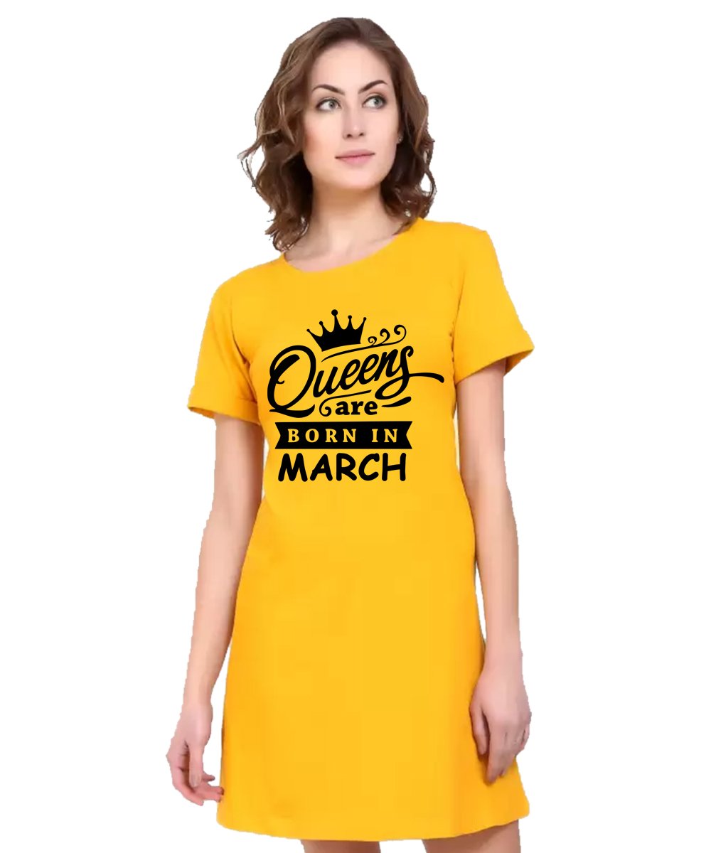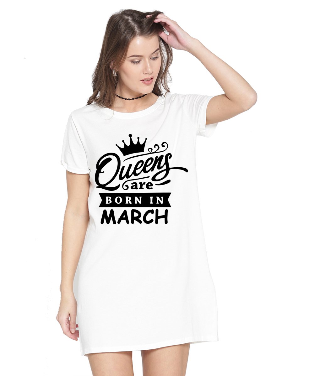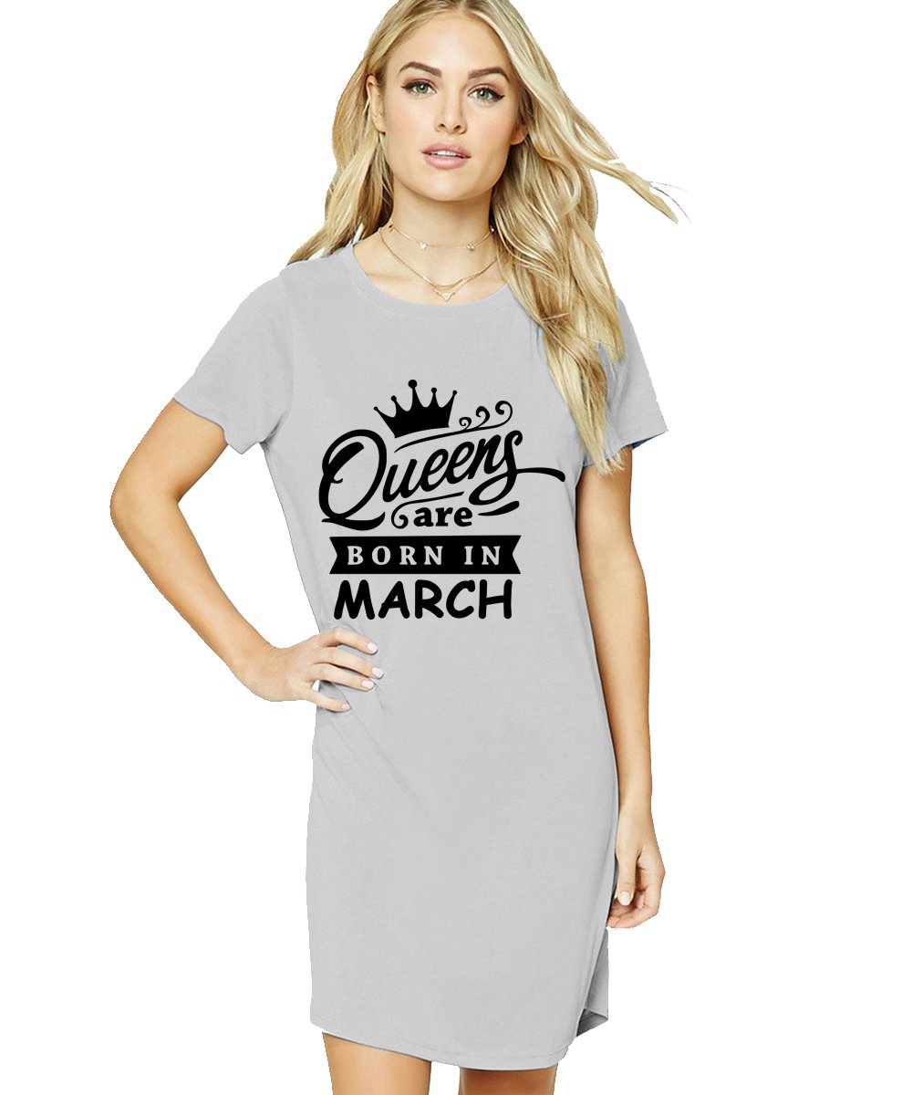 Caseria Women's Cotton Biowash Graphic Printed T-Shirt Dress with side pockets - Queens Born In Mar