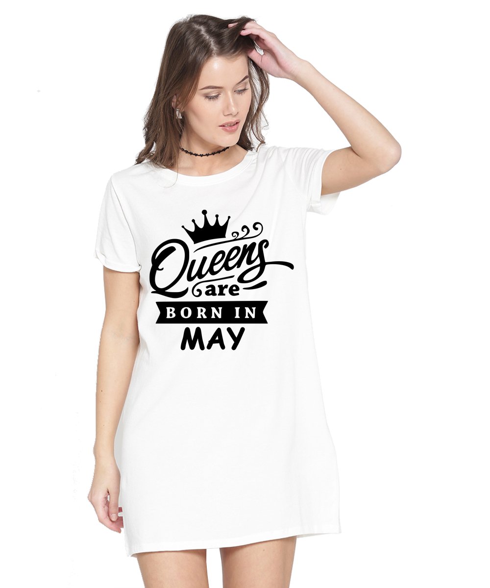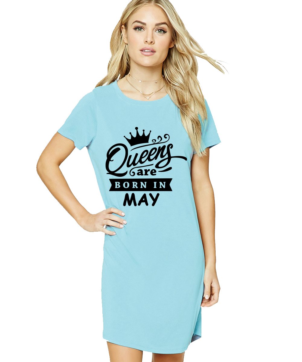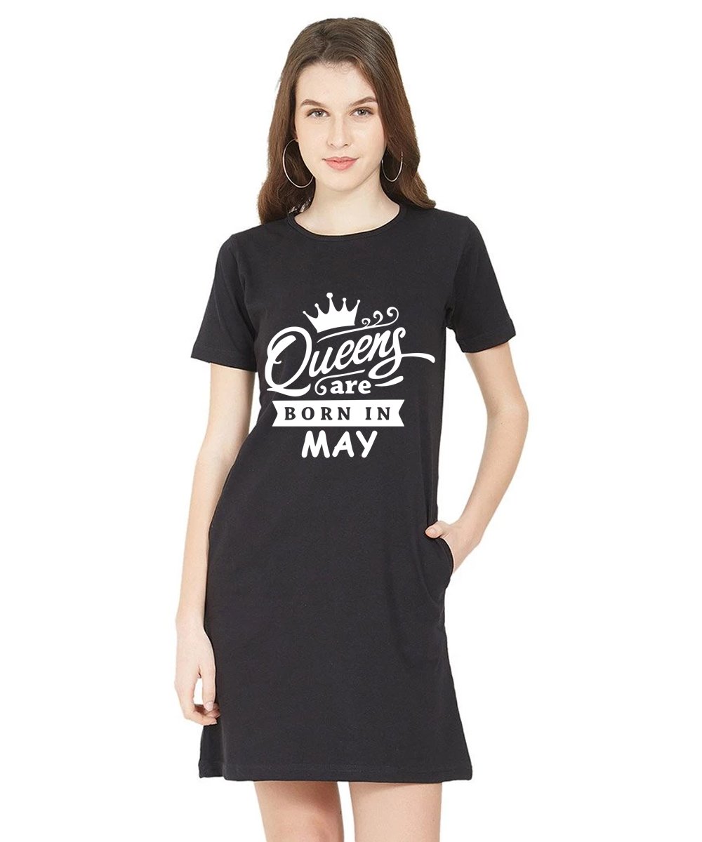 Caseria Women's Cotton Biowash Graphic Printed T-Shirt Dress with side pockets - Queens Born In May