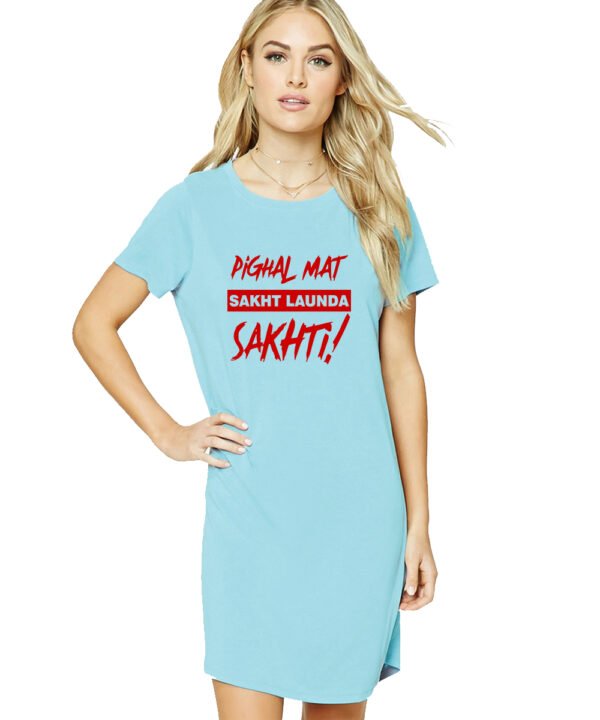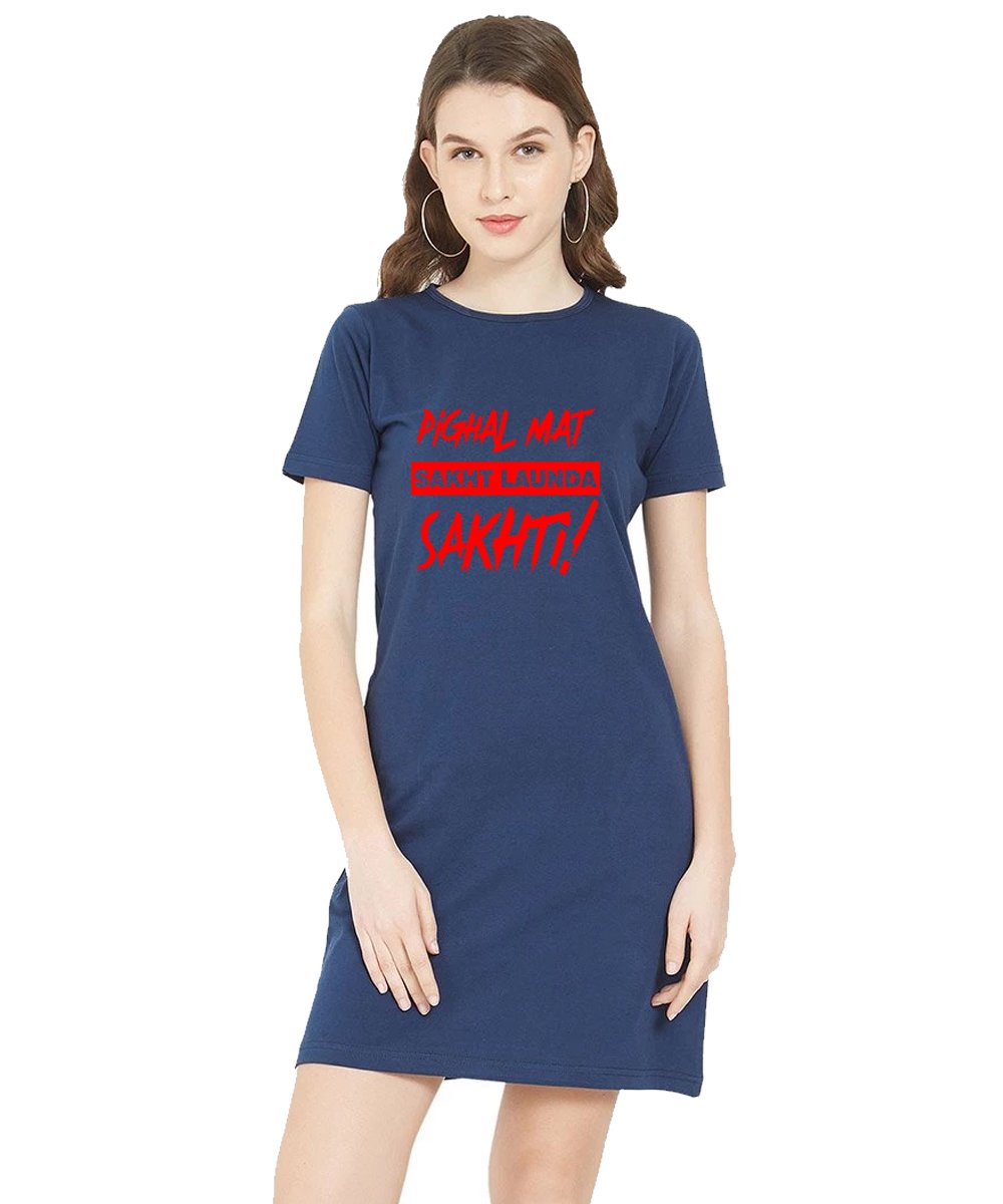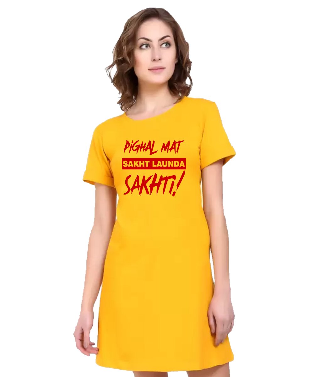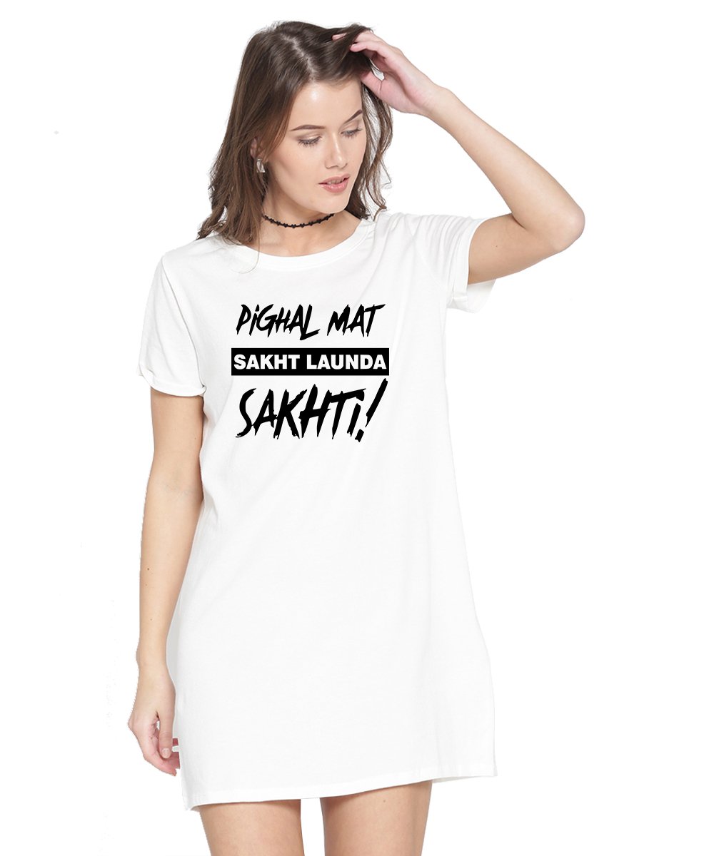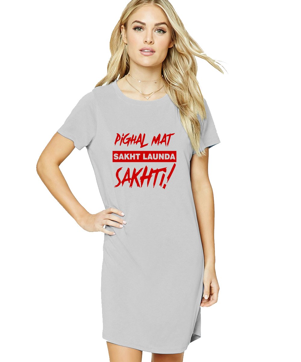 Caseria Women's Cotton Biowash Graphic Printed T-Shirt Dress with side pockets - Sakht Launda Sakhti