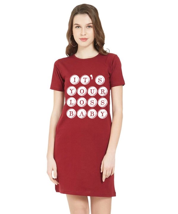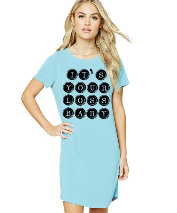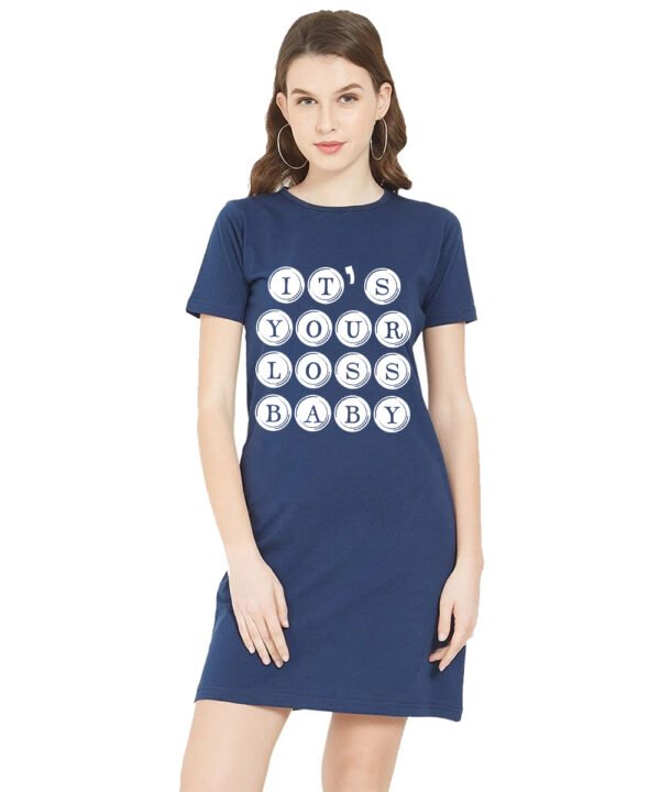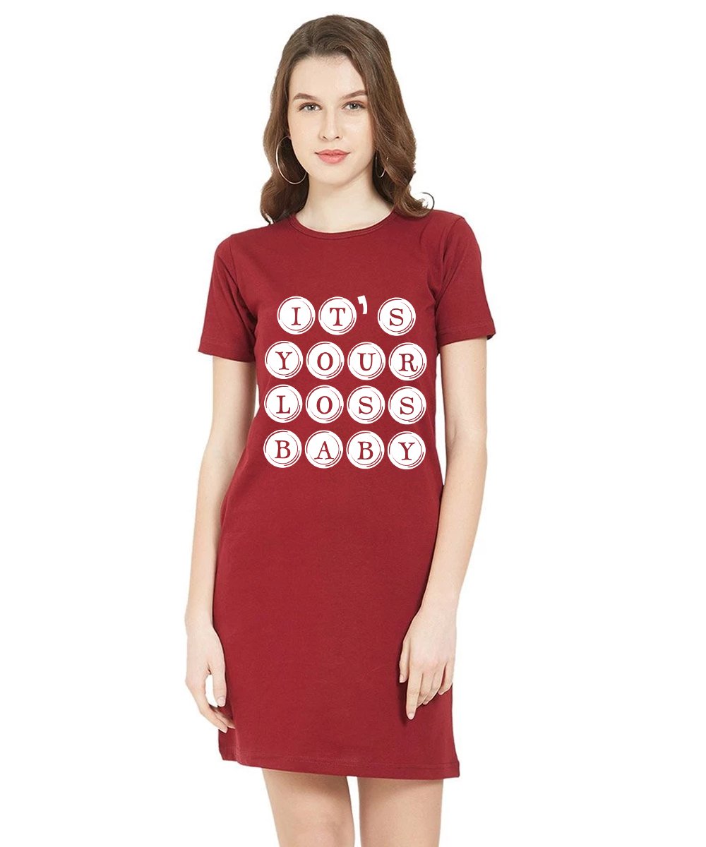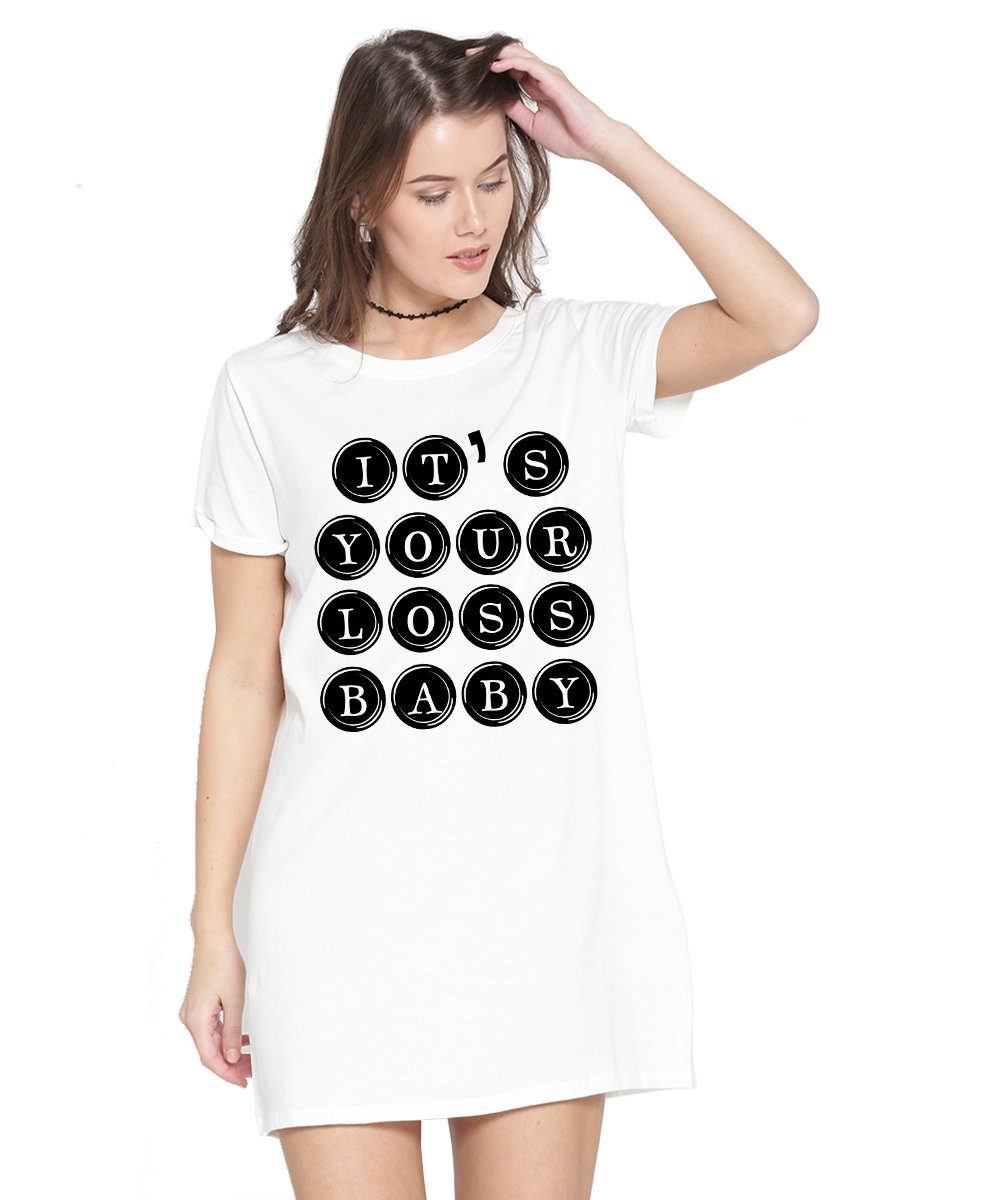 Caseria Women's Cotton Biowash Graphic Printed T-Shirt Dress with side pockets - Your Loss Baby